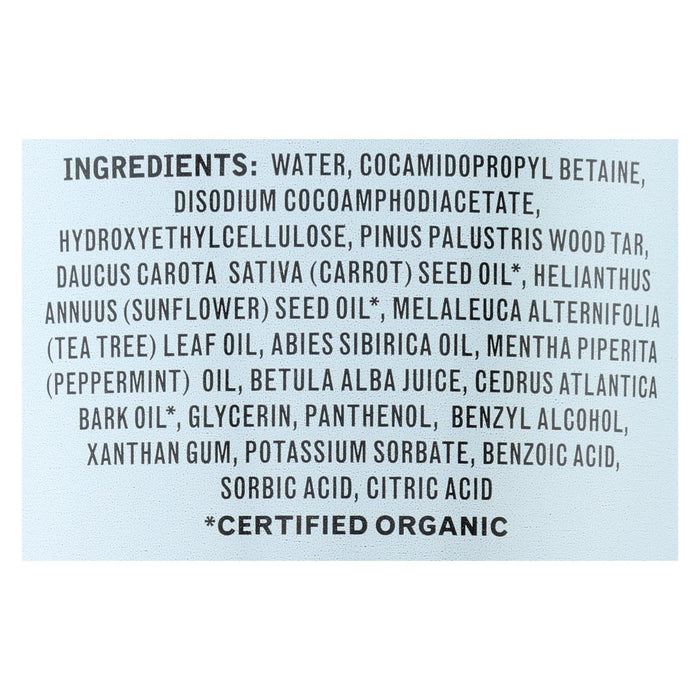 ingredients : water;cocamidopropyl betaine;disodium cocoamphodiacetate;hydroxyethylcellulose;pinus palustris wood tar;daucus carota sativa;carrot;seed oil;helianthus annuus;sunflower;melaleuca alternifolia;tea tree;leaf oil;abies sibirica oil;mentha piperita;peppermint;oil;betula alba juice;cedrus atlantica bark oil;glycerin;panthenol;benzyl alcohol;xanthan gum;potassium sorbate;benzoic acid;sorbic acid;citric acid