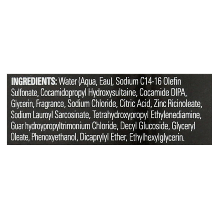 ingredients : water;aqua;eau;sodium c14-16 olefin sulfonate;cocamidopropyl hydroxysultaine;cocamide dipa;glycerin;fragrance;sodium chloride;citric acid;zinc ricinoleate sodium lauroyl sarcosinate;tetrahydroxypropyl ethylenediamine;guar hydroypropyltrimonium chloride;decyl glucoside;glyceryl oleate;phenoxyethanol;dicaprylyl ether;ethylhexylglycerin
