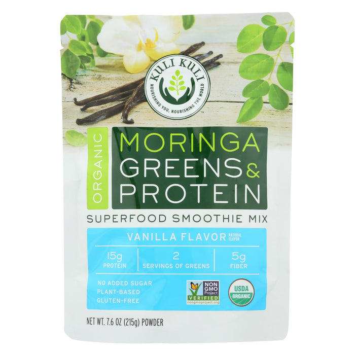 Kuli kuli's vanilla moringa greens & protein powder is a superfood drink mix. Each 7.3 oz. Pouch of mix is made with powder from the moringa plant, which contains twice as much protein, three times as much calcium, twice as much iron and 1.5 times as much fiber as kale. Our superfood drink mix is non-gmo and is made from simple, organic ingredients.