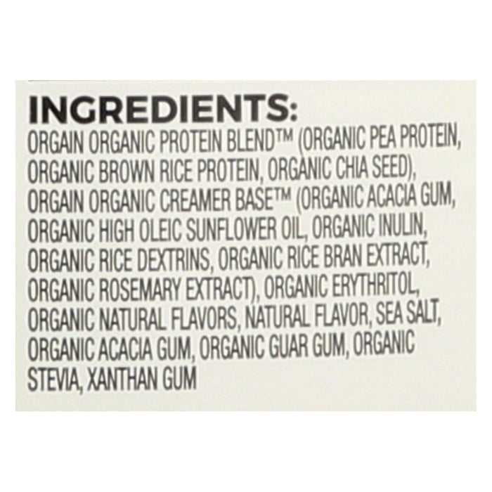 ingredients : orgain organic protein blend™;organic pea protein;organic brow rice protein;organic chia seed;orgain organic creamer base;organic acacia organic high oleic sunflower oil organic rice dextrin organic rice bran extract;organic rosemary extract;organic erythritol organic natural flavor! organic acacia sea salt;organic stevia;organic guar gum;xanthan gum;natural flavor